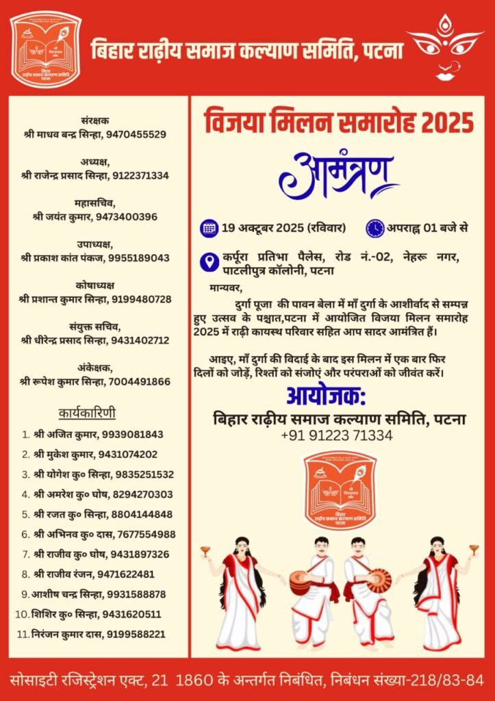 पटना, 17 अक्टूबर 2025 – बिहार राढ़ीय समाज कल्याण समिति द्वारा 19 अक्टूबर को कर्पूरी प्रतिभा पैलेस, नेहरू नगर में भव्य विजय मिलन समारोह 2025 आयोजित किया जाएगा। यह कार्यक्रम माँ दुर्गा की विजय के उपलक्ष्य में रखा गया है, जिसमें राढ़ीय समाज के लोग शामिल होंगे।